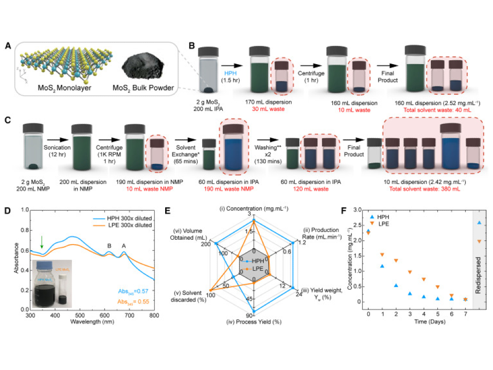 The work by Jinrui Chen and colleagues, published in Cell Reports Physical Science, presents a stabilizer-free, low-waste method to exfoliate 2D materials using high-pressure homogenization. This approach improves yield, cuts solvent use, and enables high-performance printed memristors with a much lower carbon footprint.